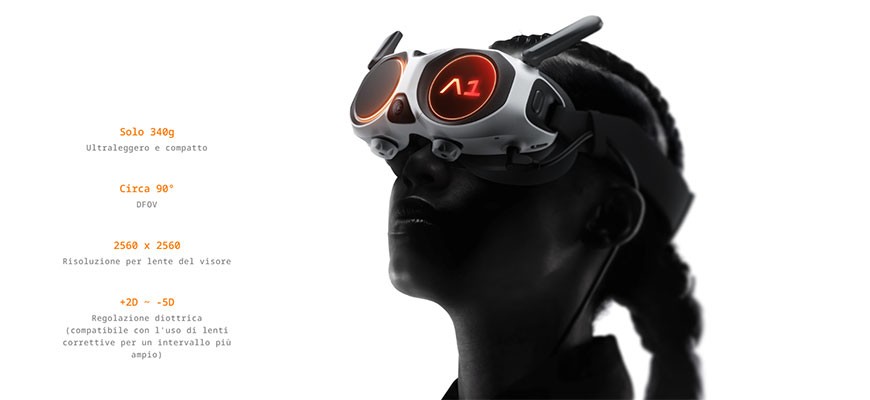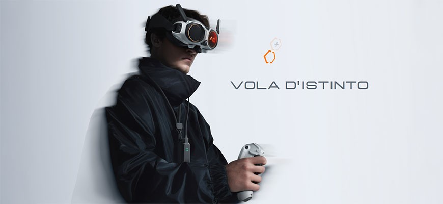 Il cuore dell’esperienza è il visore Vision, con schermi micro-OLED ad alta risoluzione e campo visivo ampio, pensato per farti sentire davvero “a bordo” del drone. Indossi il visore, giri la testa e lo sguardo segue in tempo reale ciò che il drone vede, con trasmissione fino a 10 km e latenza ridottissima.
