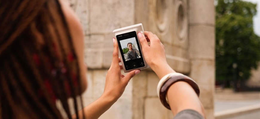 Grazie alla modalità Layered Photo, puoi combinare due immagini — una scattata con la camera principale e una con quella frontale per selfie — scegliendo tra quattro template e creando stampe uniche e memorabili.