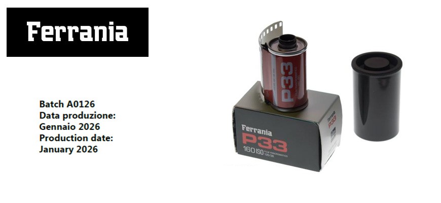 La pellicola Ferrania P33 Edizione 2026 appartiene al batch A0126, con produzione risalente a gennaio 2026, confermando l’impegno del marchio nel mantenere viva la tradizione fotografica analogica attraverso materiali di alta qualità.