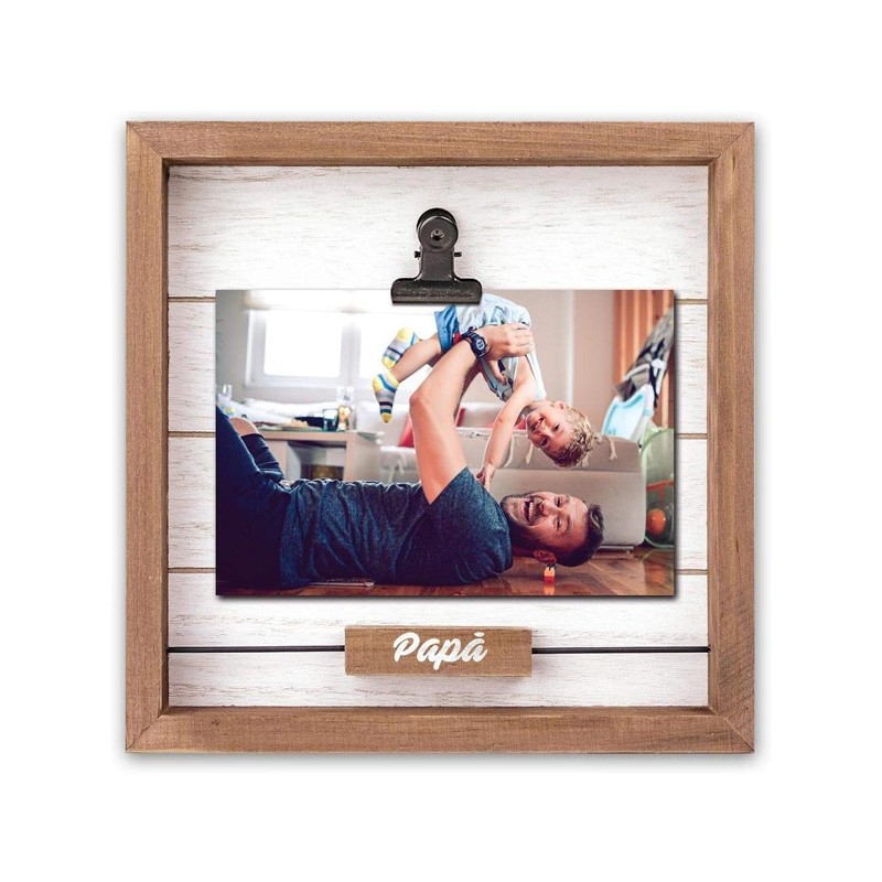 Cornice Camilla HI in legno, colore marrone e bianco, con scritta bianca MAMMA su supporto a rilievo, con clip portafoto, da tavolo, adatta alla festa della mamma, ideale per celebrare anniversari o compleanni, adatta per casa e ufficio.