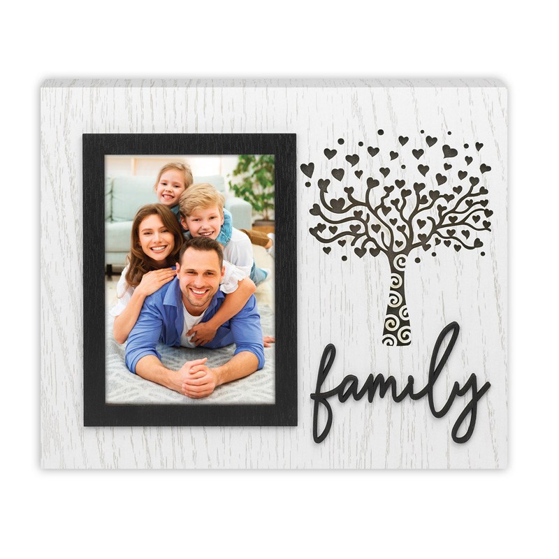 Cornice Zelda in legno, colore bianco, con decoro traforato a forma di albero, bordo nero a rilievo, scritta FAMILY, da tavolo, idea regalo originale, adatta per casa e ufficio.