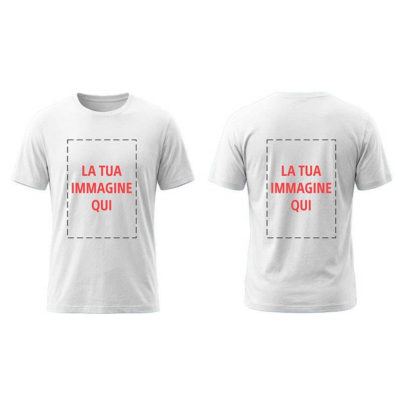T-shirt bianca personalizzabile con foto e scritte sulla parte frontale.Disponibile in varie taglie da scegliere prima di aggiungere foto o scritte.Prodotto personalizzabile on line cliccando sul pulsante "personalizzami ora!"
