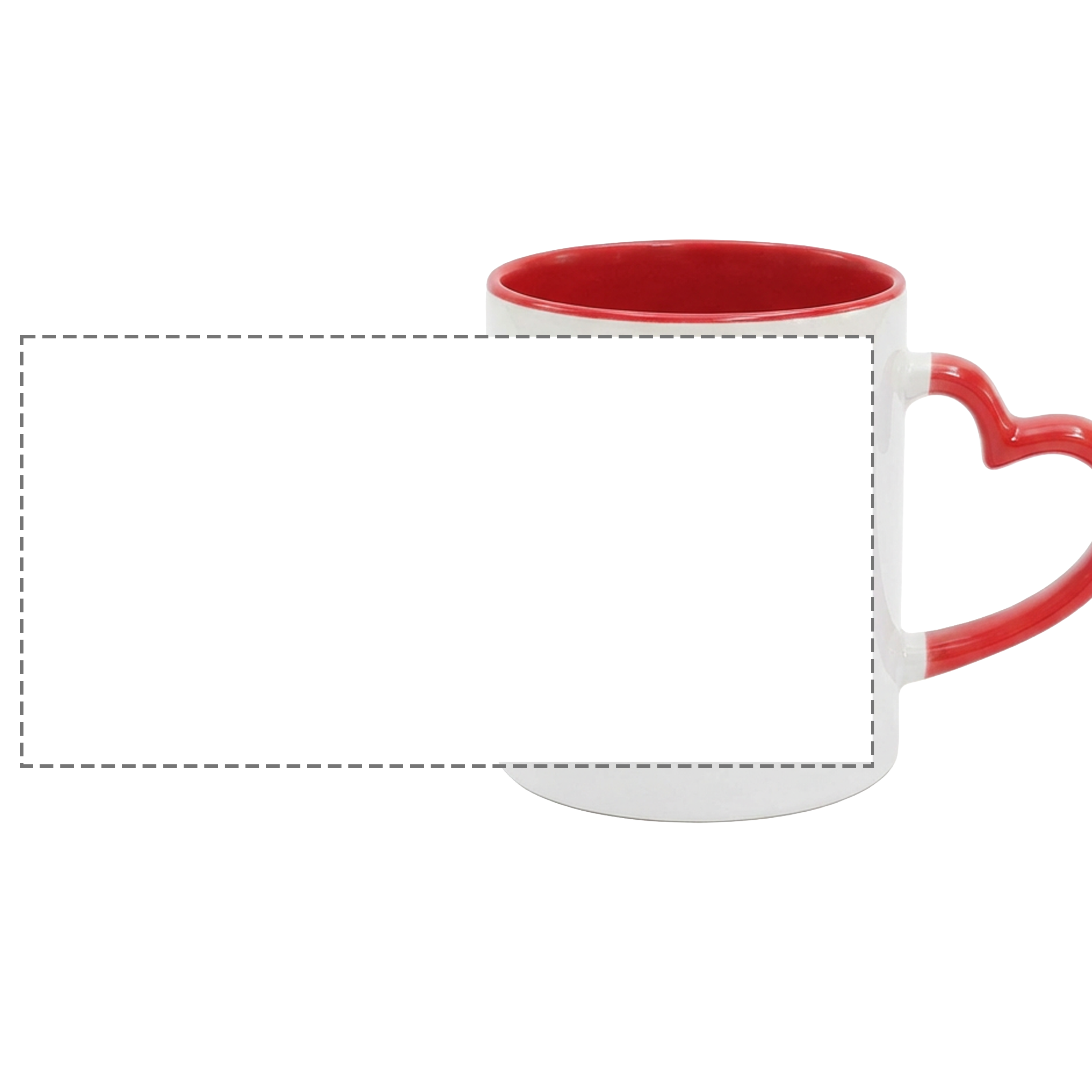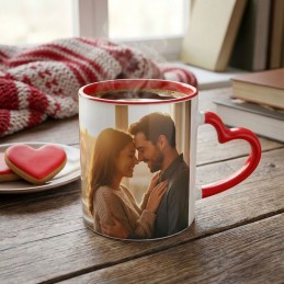 Foto Tazza stile MUG americana di colore esterno bianco, interno rosso, con manico rosso a forma di cuore, .