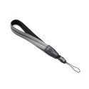 Il cinturino da polso in tessuto può essere fissato rapidamente e facilmente alla fotocamera tramite una fibbia. Due le colorazioni disponibili: nero-rosso e nero-grigio chiaro. Entrambe le varianti sono decorate con un sottile logo Leica.